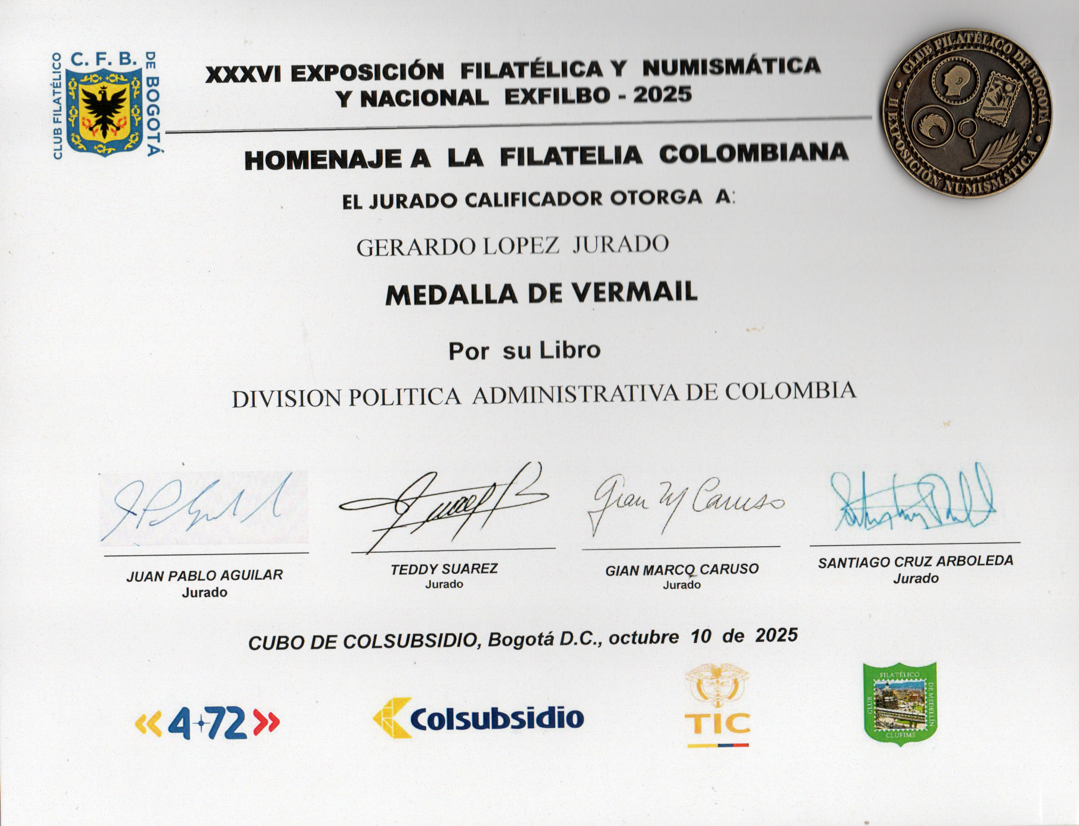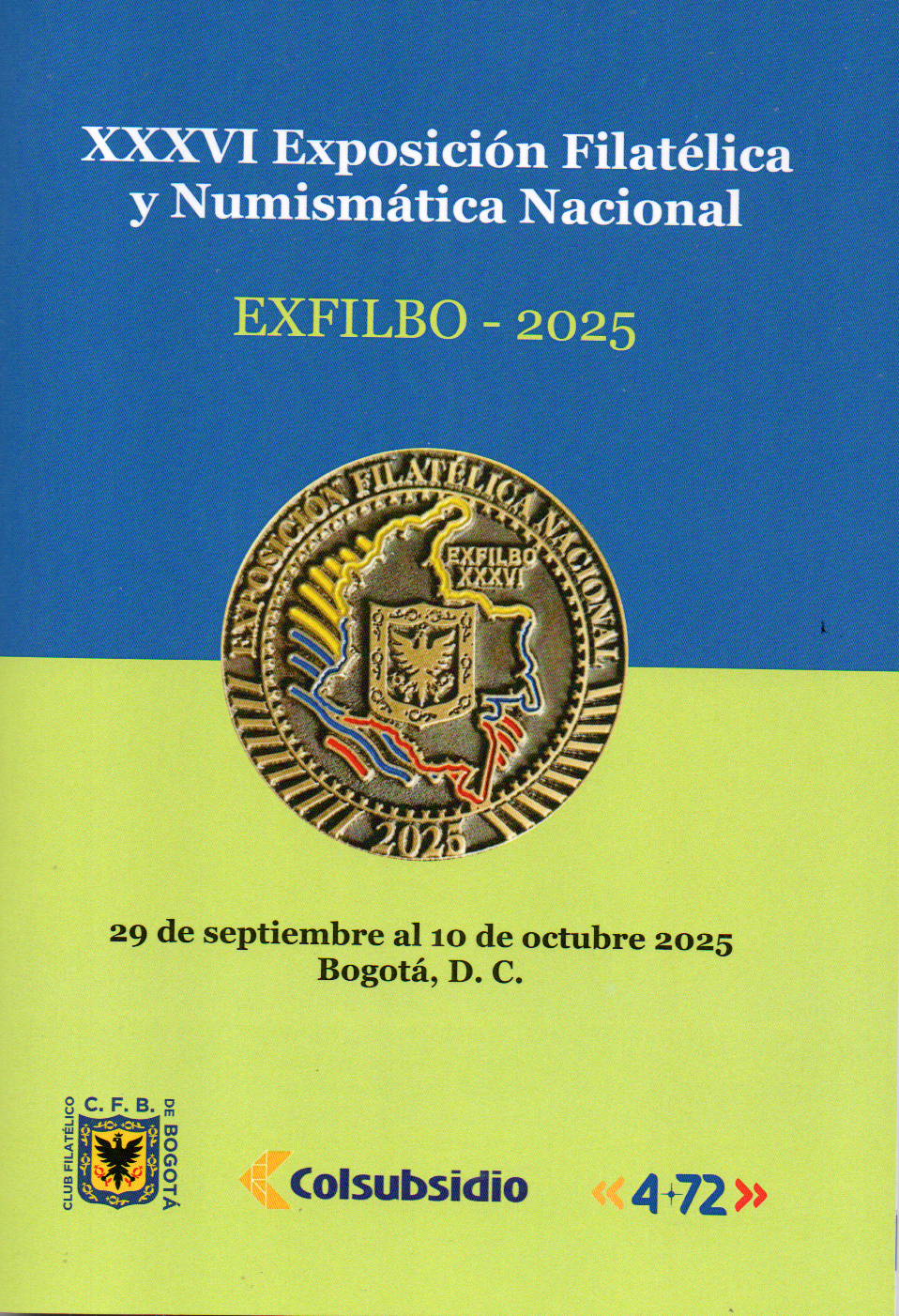 La Exposición Filatélica y Numismática Nacional, organizada por el Club Filatélico de Bogotá, se llevó a cabo con el auspicio de la Federación Filatélica Colombiana – FEFILCO, el Ministerio de Tecnologías de la Información y las Comunicaciones – Mintic – el Operador Postal Nacional – 4-72 – y la Caja de Compensación Familiar – Colsubsidio, entre el 29 de septiembre y el 10 de octubre del presente año, en la ciudad de Bogotá DC., capital  de la República de Colombia.