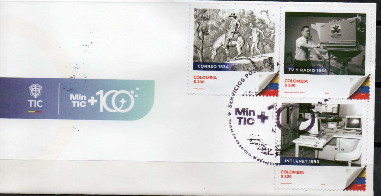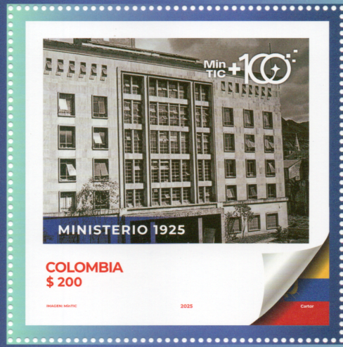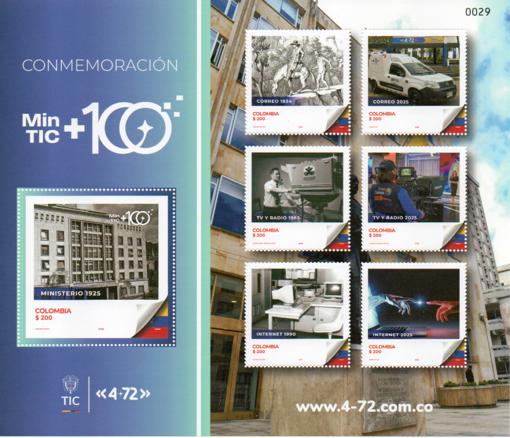 La hoja bloque: La hoja bloque en tamaño de 20 X 17 cm. contiene 7 estampillas. En la parte superior izquierda aparece el título de la emisión: «Conmemoración Min Tic + 100 años».