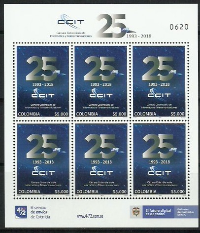 La hoja filatélica. La hoja filatélica, de 100 x 115 mm, numerada, contiene 6 estampillas y lleva como titulo el título de la emisión: CCIT Cámara Colombiana de Informática y Telecomunicaciones 25 años 1993 – 2018.