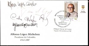 Bogotá, Colombia, se hizo en el día de ayer, 8 de Octubre de 2008, el lanzamiento de una estampilla, aprobada por Resolución Nº 050 del 8 de octubre de 2008 de Servicios Postales Nacionales, para destacar la labor de un hombre que sirvió a Colombia: el presidente Alfonso López Michelsen. Alfonso López Michelsen es reconocido por muchos como uno de los principales pensadores contemporáneos de Colombia. Se decía que cada vez que hablaba «ponía a pensar al país». Fue el 49 Presidente de Colombia en el período 1974-1978, con el lema de su Gobierno del Mandato Claro. Fuera de todas sus cualidades como líder político en Colombia, reconocido a nivel internacional por la firma del tratado Torrijos-Carter que garantizaba la futura devolución del Canal de Panamá por parte de los Estados Unidos a Panamá, como fundador del Movimiento Revolucionario Liberal (MRL), por dedicarse durante su exilio en México a la literatura a través de la novela y el ensayo político y jurídico, es distinguido como uno de los principales conocedores y defensores de la música vallenata en Colombia. Fundó el Festival de la Leyenda Vallenata en Valledupar, junto al maestro Rafael Escalona y Consuelo Araujo Noguera. A este ilustre colombiano, el Gobierno Nacional a través del Ministerio de Comunicaciones y Servicios Postales Nacionales le rinde un homenaje a un año de su muerte acaecida en Bogotá, Colombia, el 11 de Julio de 2007.